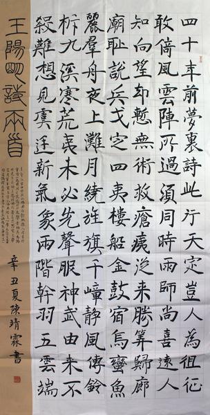 大家好,我的名字叫陈靖霖。今年10岁,我是一个开朗活泼的女孩。我的爱好广泛:我喜欢读书,因为读书能够让我学到知识;喜欢画画,因为画画能增加我的美感;我喜欢书法,因为书法能让我修身养性。是的,在我的众多爱好中,我最喜欢书法,从第一次提软笔写字至今已有三年了,每次写字我都全神贯注,一丝不苟。因为能在书法的世界里徜徉是一件多么快乐和幸福的事。我会坚持我的书法爱好并且为之努力。