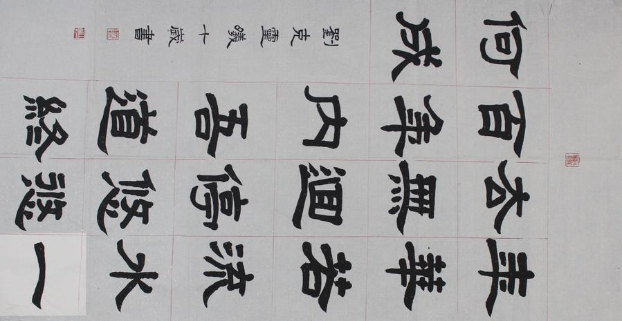 我是刘克灵曦,今年10岁,我8岁开始学习书法,我在书写书法过程中,接触到很多美的诗词、名人名言,感受我们中国汉字和书法的魅力和浓烈的文化气息,更多地了解了我们中国优秀的传统文化和灿烂传统文化的博大精深,同时也享受到了书法给我带来的乐趣。在之后的成长过程中,我要持之以恒的学习和练习书法,不断培养和激发我书写书法的兴趣,使我在轻松书写书法的同时,还能享受中华传统文化的魅力。